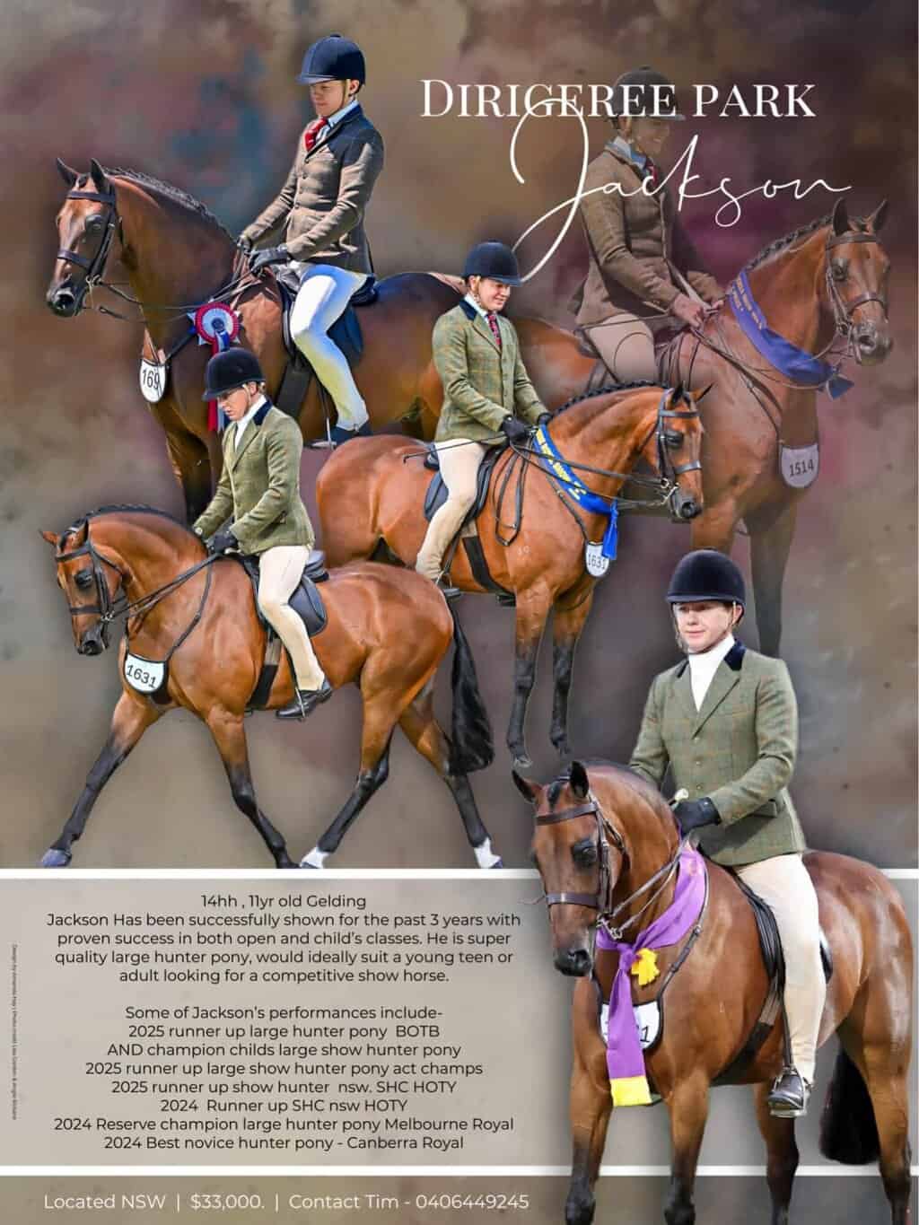 Jackson has been successfully shown for the past 3 years with proven success in both Open and Child's classes. He is a super quality large hunter pony, would ideally suit a young teenager or an adult looking for a competitive show horse.