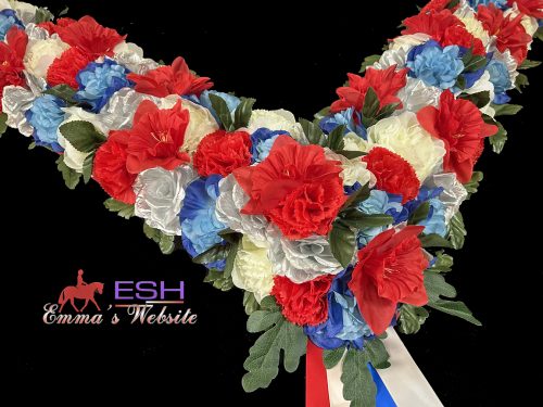 Standard Double Row medium/large size Garland. Standard flowers of Roses, Peonies & Carnations. Matching ribbon rosette with pearls. Can have a printed tail added or sold as is complete.